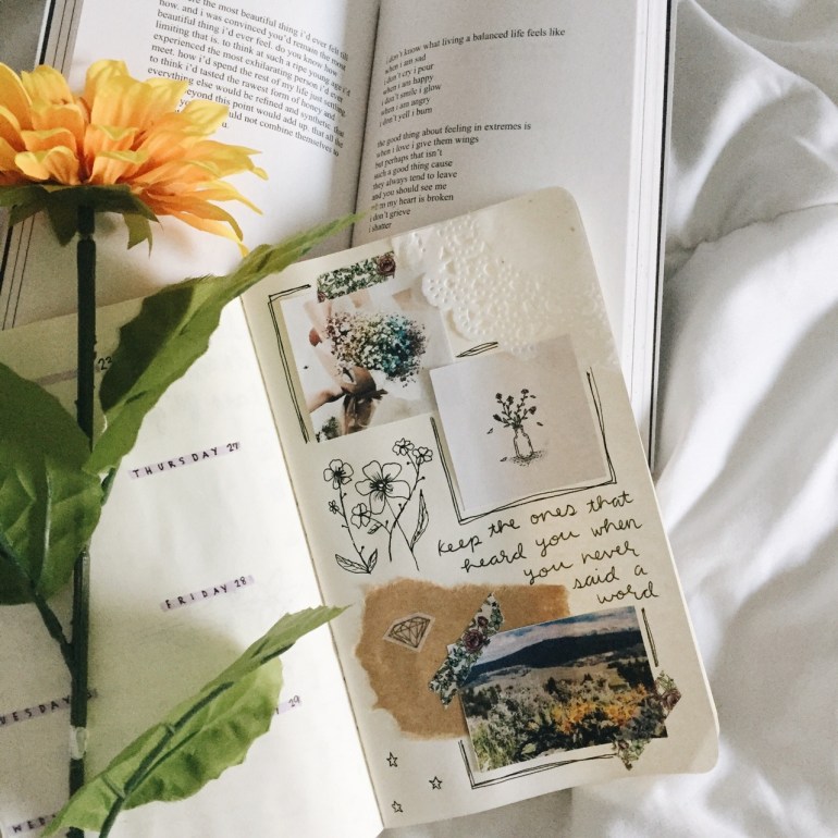 so i lose a lot of sleep to overthinking, and last night i was thinking about my bujo and decided to try and incorporate my art journal into it. on the left side is a weekly spread and on the right is an art journal spread. 🌻💗